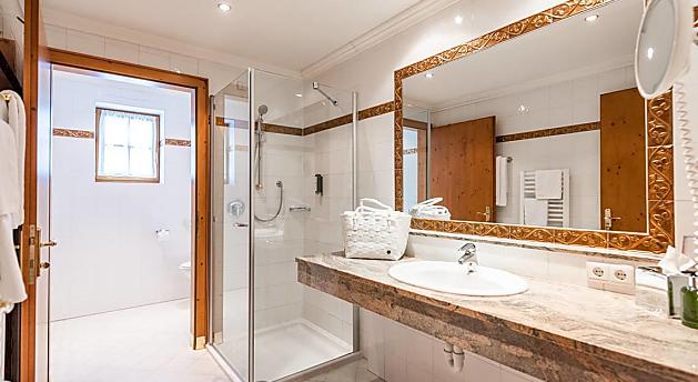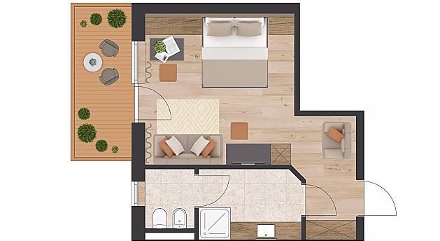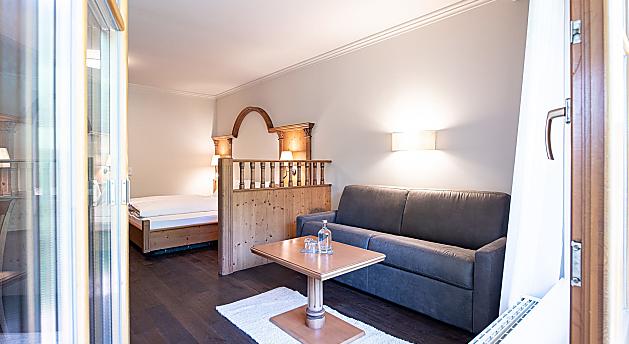 The spacious junior suites for 2 to 4 people with lounge area and balcony include a bathroom with shower, separated toilet and are furnished with hairdryer, make-up mirror, bathrobe, TV, Wi-Fi, safe and telephone.