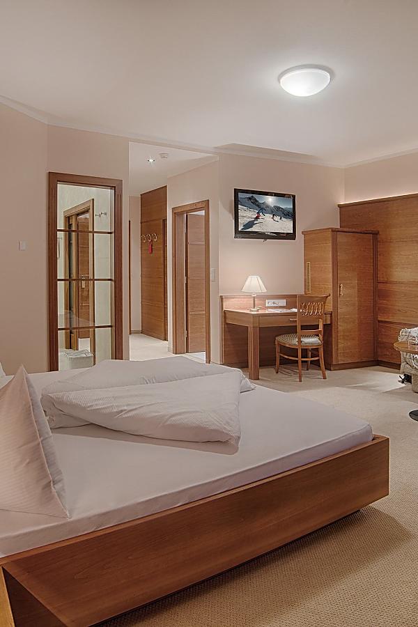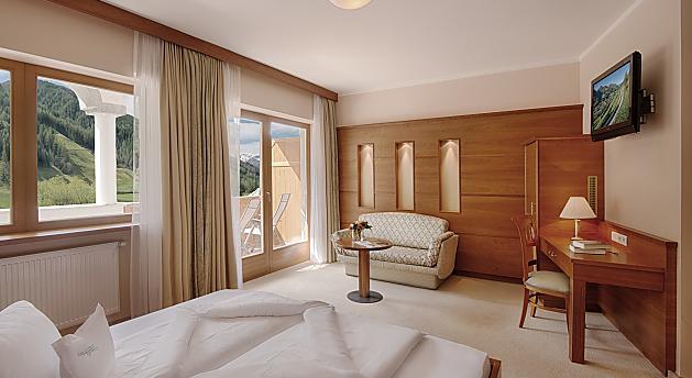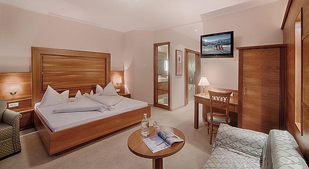 The spacious junior suites for 2 to 4 people with south-facing balcony include a desk, bathroom with shower and bathtub, separated toilet and bidet and are furnished with hairdryer, make-up mirror, bathrobe, TV, Wi-Fi, safe and telephone.