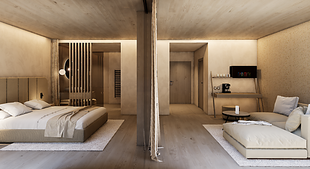 Spacious new suites for 2 to 4 persons on the 3rd floor with a panoramic south-facing balcony have a cozy living room, bathroom with shower, separate toilet with bidet, and are equipped with a designer refrigerator, hair dryer, makeup mirror, bathrobe, 2 TVs, W-LAN, safe and telephone.