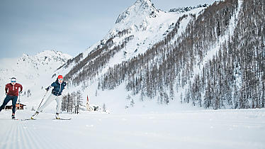 On all sides of the valley, the white peaks surround the hotel like glistening pearls. Winter hiking trails and high-altitude cross-country ski trails wind their way through the landscape. At the heart of it all, two ski areas that are different from the others.