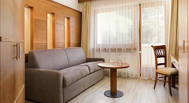 Le ampie suite da 2 a 5 persone con balcone esposto a sud, pavimento in legno design, sono dotate di un salotto accogliente e un bagno con doccia e vasca, WC separato e bidet e sono attrezzate con asciugacapelli, specchio da trucco, accappatoio, due TV, WiFi, cassaforte e telefono.