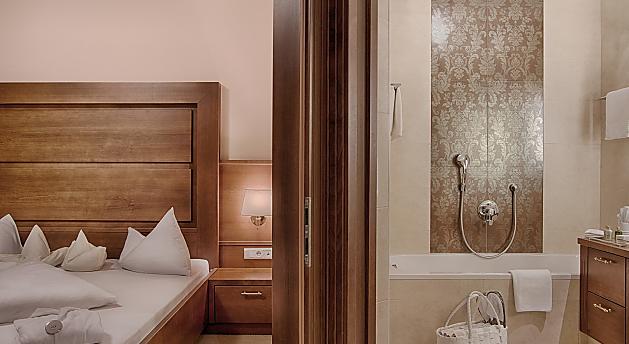 Le Junior suite da 2 a 3 persone con terrazza esposta a sud ed un giardino loggia privato sono dotate di pavimento in legno, una scrivania, un bagno con doccia e vasca, WC separato e bidet e sono attrezzate con asciugacapelli, specchio da trucco, accappatoio, TV, WiFi, cassaforte e telefono.