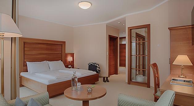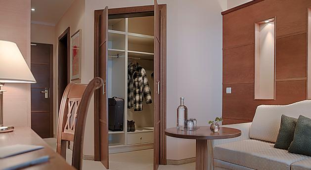 Le ampie suite da 2 a 5 persone con balcone esposto a sud sono dotate di una stanza da letto per bambini separata, un bagno con doccia e vasca, WC separato e bidet e sono attrezzate con asciugacapelli, specchio da trucco, accappatoio, due TV, WiFi, cassaforte e telefono.