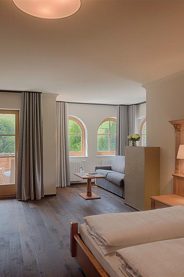 Le suite da 2 a 4 persone con pavimento in legno, zona giorno a bovindo e stufa hanno un balcone rivolto a sud-ovest, bagno con doccia e vasca, WC separato Geberit Aquaclean e sono dotate di asciugacapelli, specchio da trucco, accappatoio, TV, W-Lan, cassaforte e telefono.