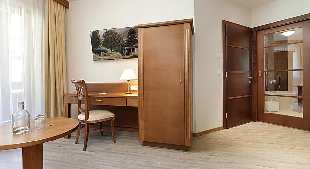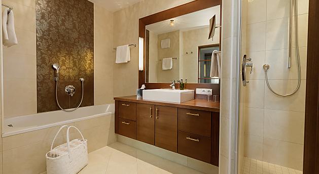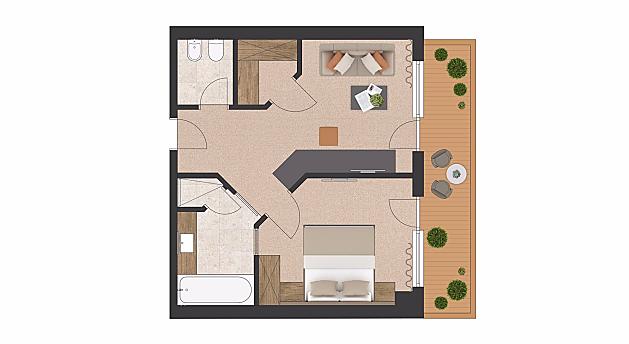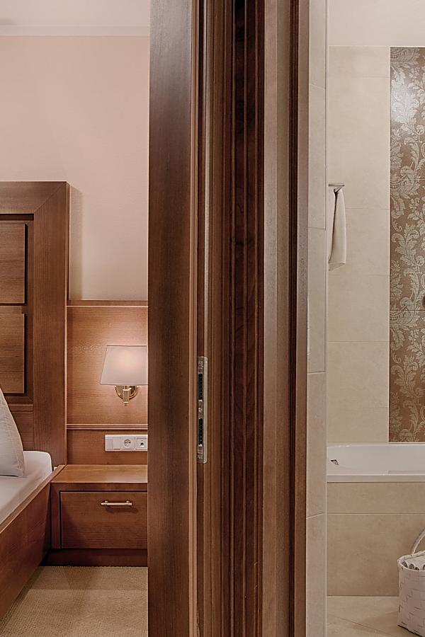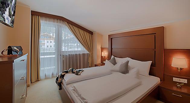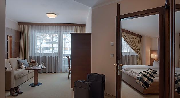 Le ampie suite da 2 a 5 persone con balcone e pavimento moderno in legno-design, sono dotate di un salottino accogliente, un bagno con doccia e vasca, WC separato e bidet e sono attrezzate con asciugacapelli, specchio da trucco, accappatoio, due TV, WiFi, cassaforte e telefono.