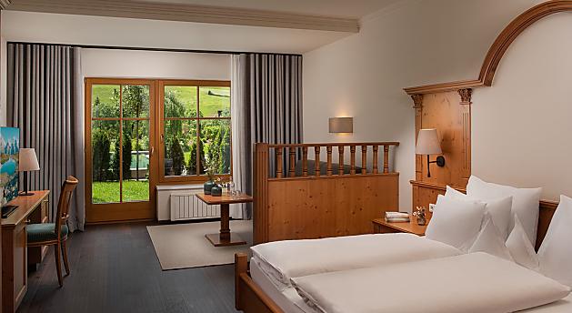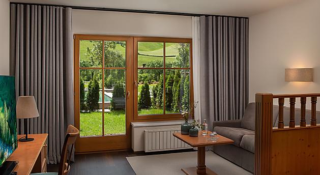 Le Junior suite da 2 a 5 persone con terrazza esposta a sud ed un giardino loggia privato con accesso al nuovo outdoor infinity pool, sono dotate di una scrivania, un bagno con vasca e bidet, WC e sono attrezzate con asciugacapelli, specchio da trucco, accappatoio, TV, WiFi, cassaforte, telefono e caffettiera.